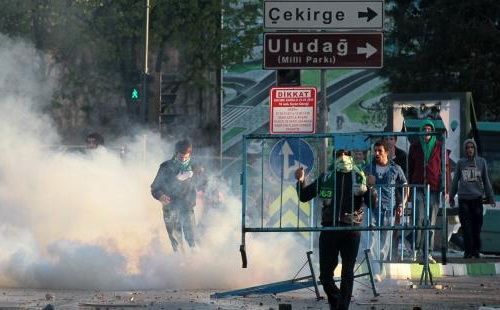 Bursaspor fans clash with police before the Turkish Super League soccer match between Bursaspor and Besiktas in Bursa, western Turkey, May 7, 2011.